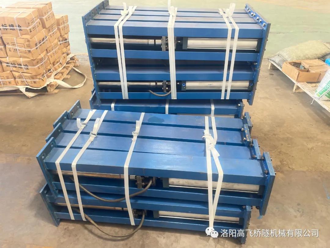 臺(tái)車配置8個(gè)插入式和32個(gè)附著式高頻自動(dòng)振搗系統(tǒng),通過(guò)高壓氣體帶動(dòng)高頻氣動(dòng)振搗器工作,作業(yè)人員可通過(guò)PLC 程序控制持續(xù)振搗時(shí)間、間隔時(shí)間、振動(dòng)次數(shù)。拱部插入式振搗系統(tǒng)通過(guò)插入式高頻振動(dòng)器的往復(fù)運(yùn)動(dòng),對(duì)拱部混凝土深部進(jìn)行充分振搗,實(shí)現(xiàn)環(huán)向、縱向及厚度方向的振搗全覆蓋,有效提升混凝土強(qiáng)度和密實(shí)度,可以從根本上解決隧道拱頂混凝土不密實(shí)導(dǎo)致脫空和空洞的難題。高頻氣動(dòng)振動(dòng)器,振動(dòng)范圍廣、深度大,使混凝土振搗密實(shí),整體提升隧道襯砌外觀質(zhì)量。