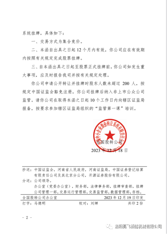 2023年 12月19 日,洛陽高飛橋隧機(jī)械股份有限公司在全國中小企業(yè)股份轉(zhuǎn)讓系統(tǒng)掛牌成功,股票代碼:874169。